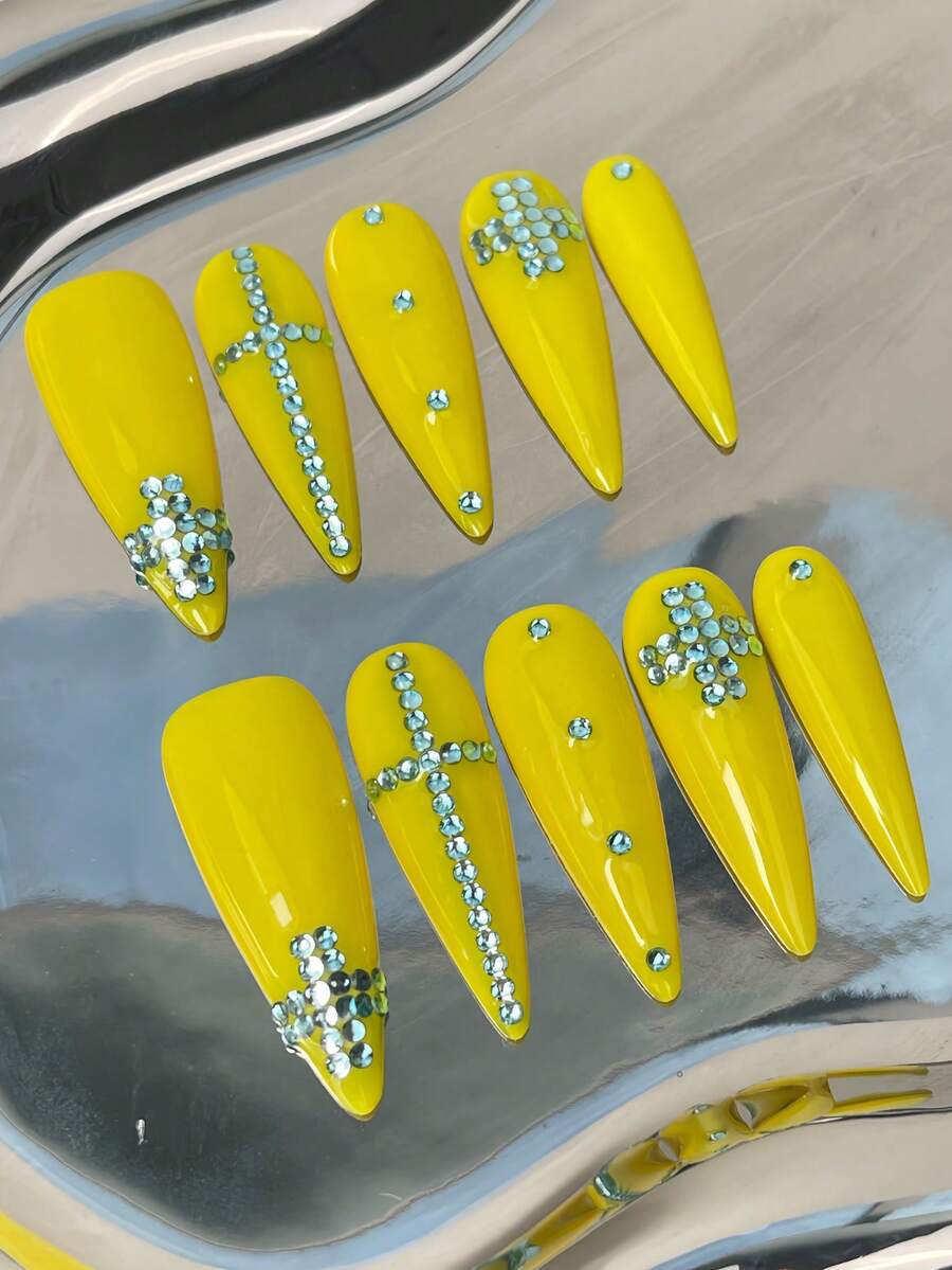10 pezzi di unghie finte applicate, realizzate a mano, rimovibili, realistiche, lunghe e appuntite, con design originale , gioielli in diamante giallo e blu, minimalista, forniture per unghie estive in stile Y2K, con adesivi e colla per unghie per donne e ragazze