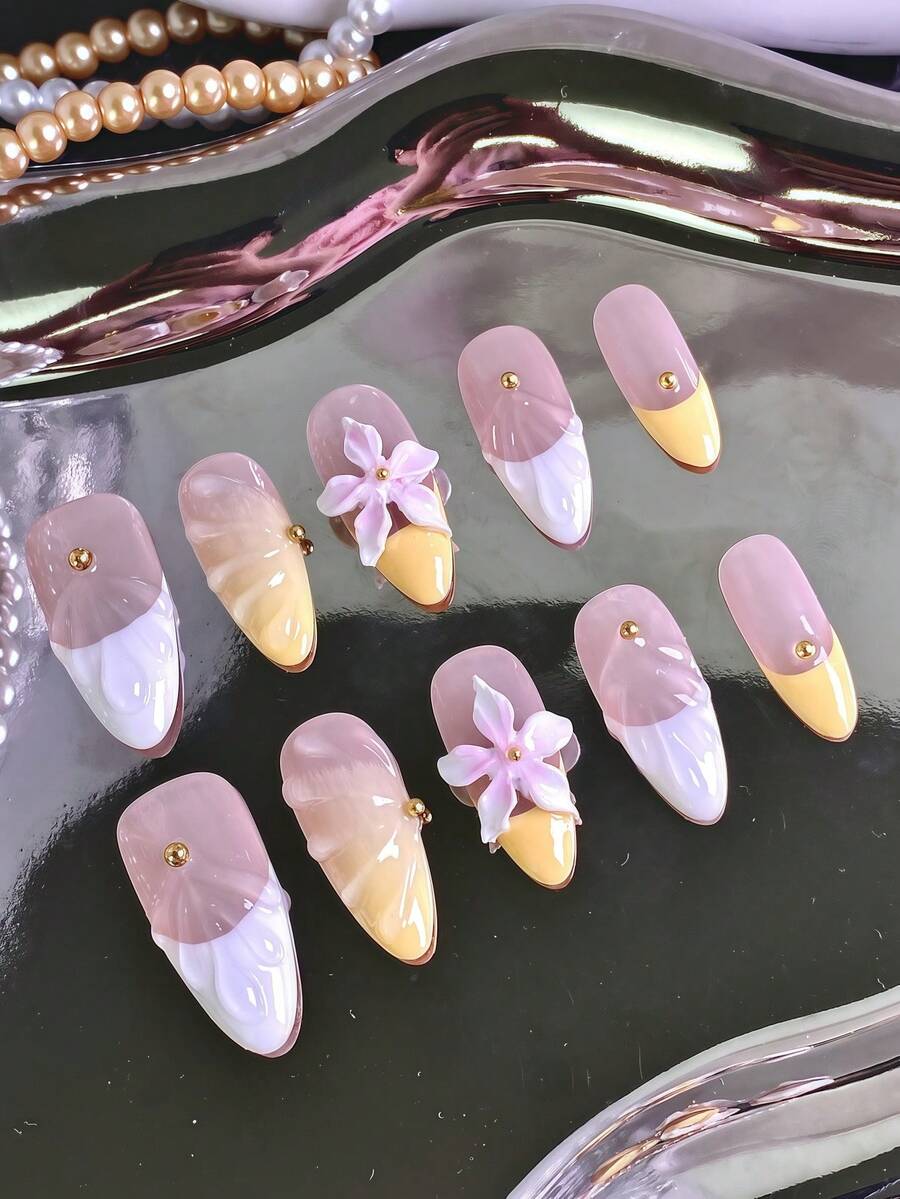 10 pezzi Unghie finte da donna a mandorla, punte francesi artigianali 3D con decorazioni floreali e gocce d'acqua multicolore, unghie acriliche lucide e complete, set per manicure con colla per unghie, regalo per Natale, feste di compleanno, collezione di unghie natalizie