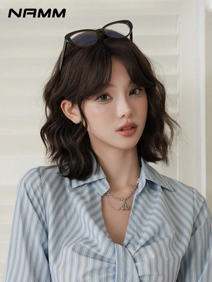 NAMM Parrucca corta riccioluta da 12 pollici per donne - Parrucca modesta con frangia a onde, in fibra sintetica morbida e setosa resistente al calore di colore marrone scuro, adatta per uso quotidiano, perfetta per vacanze, festival musicali, celebrazioni - Sakura Celebrations Glam & festa Street Wear Photography Use
