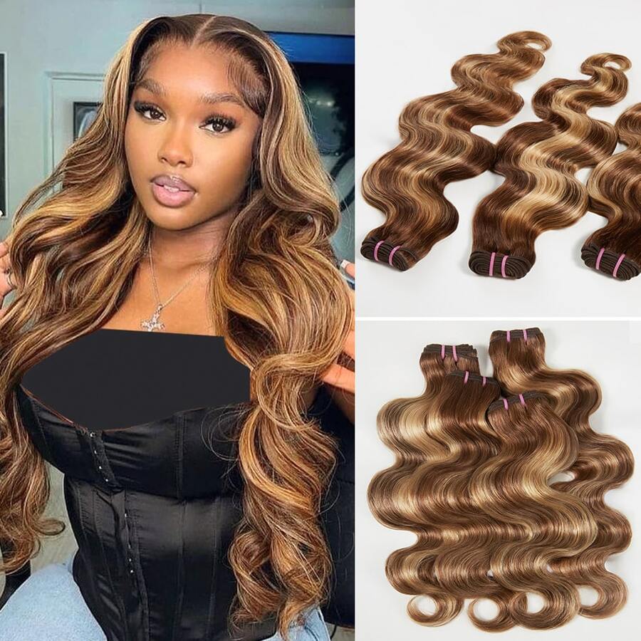 HJ WEAVE BEAUTY Extension per capelli umani Remy, castano chiaro con mèches, grado 12A, P4/27, castano miele, non trattati, brasiliani vergini, ondulati, per donne, trama doppia, 14-26 pollici, resistenti al calore