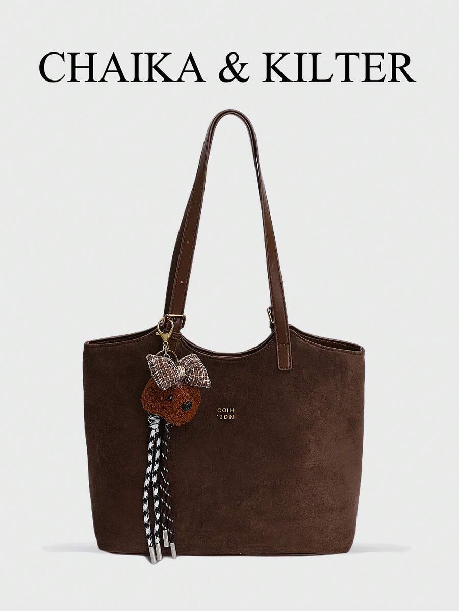 1 pezzo Borsa a spalla in tessuto scamosciato tinta unita, borsa casual retrò da donna con chiusura a scatto e cerniera, borsa a tracolla di grande capacità adatta per viaggi, shopping, appuntamenti, regalo da donna, adatta per ragazze adolescenti, studenti universitari e lavoratori d'ufficio, ideale per ufficio, scuola, lavoro, pendolarismo, attività all'aperto, viaggi, picnic (venduta con ciondolo)