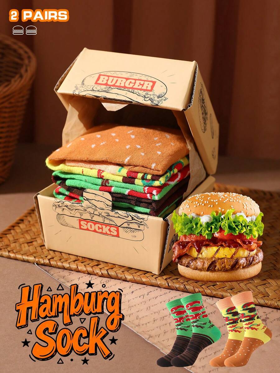2 paia di calzini a mezza gamba multicolore, design unisex per coppie, calzini morbidi a tema hamburger, design creativo ispirato al cibo, comodi e versatili, adatti per compleanni, San Valentino, Pasqua, Ramadan, appuntamenti, riunioni di famiglia