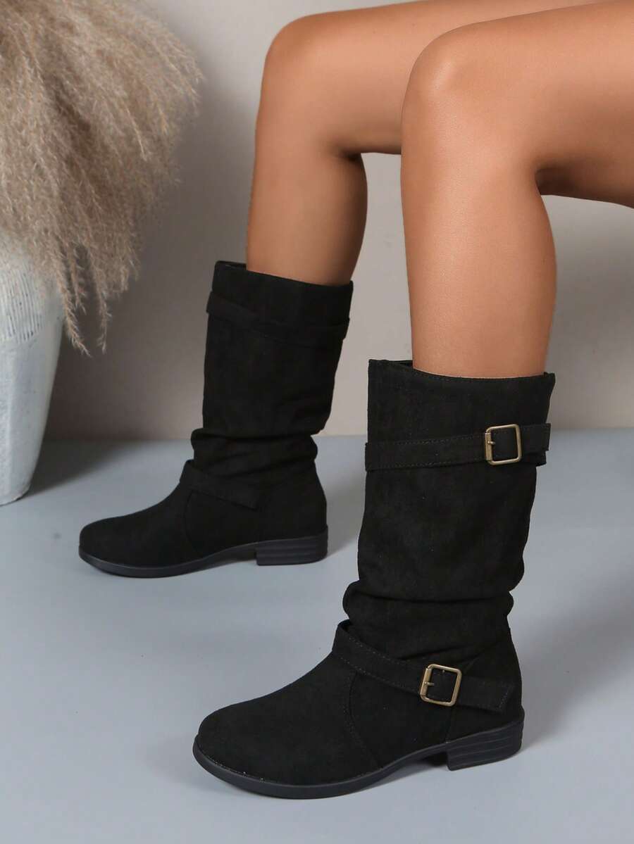 2025 Autunno/Inverno Nuovi stivali con tacco impilato plissettato per donna, stile western con punta affusolata, tacco largo vintage nero, stivali al polpaccio, adatti per feste