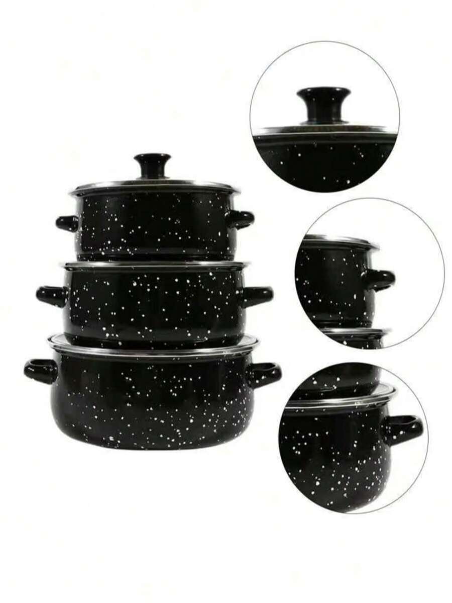 3 Pezzi Set di Pentole Smaltate Multifunzione, Leggero con Coperchi in Vetro, Comprende una Pentola, una Casseruola e una Padella Antiaderente, Facile da Pulire, Adatto per Fornelli a Gas e Elettrici, Essenziale Durevole per la Cucina Domestica e la Ristorazione, Ideale anche per il Campeggio all'Aperto.
