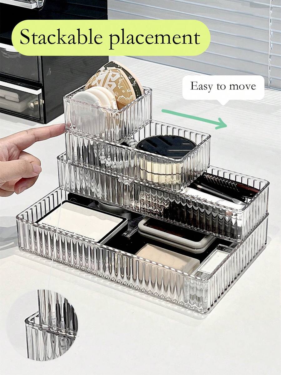 4 pezzi/2 pezzi/1 pezzo Scatola organizzatrice per il trucco da scrivania, scatola portaoggetti in materiale PET trasparente spesso, design a righe verticali elegante, minimalista e alla moda, impilabile per pennelli trucco, prodotti per la cura della pelle, rossetti, profumi, multifunzionale per cancelleria, accessori, gioielli