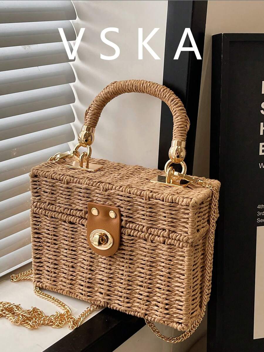 Borsa da vacanza con motivo quadrato minimalista alla moda, borsa quadrata retrò piccola, nuova borsa intrecciata casual e alla moda, borsa a spalla, borsa a tracolla, borsa a mano