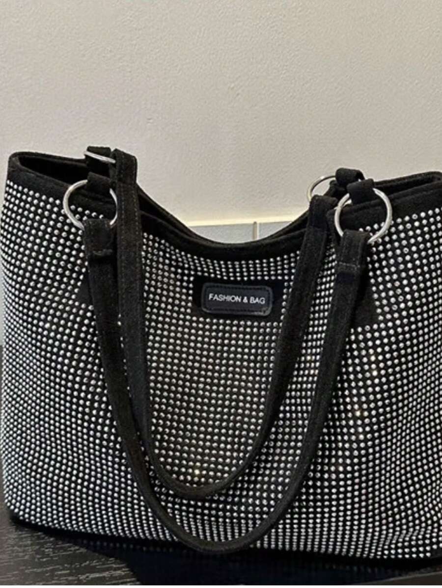 Borsa a tracolla capiente da donna, borsa shopping stile moda con strass, nera