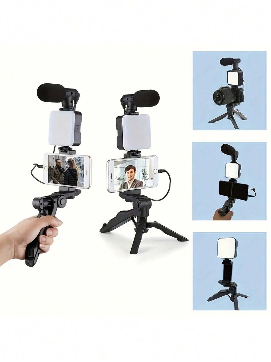 Supporto per fotocamera di telefono cellulare con luce LED rotante, mini microfono a fucile, supporto per telefono cellulare e treppiede pieghevole, stabilizzatore selfie portatile, supporto intelligente regolabile per interviste Vlog, kit di illuminazione live streaming LED - Treppiede da tavolo multifunzione in ABS, nero, treppiede portatile con altezza regolabile, design portatile a mano, perfetto per selfie, video e live streaming