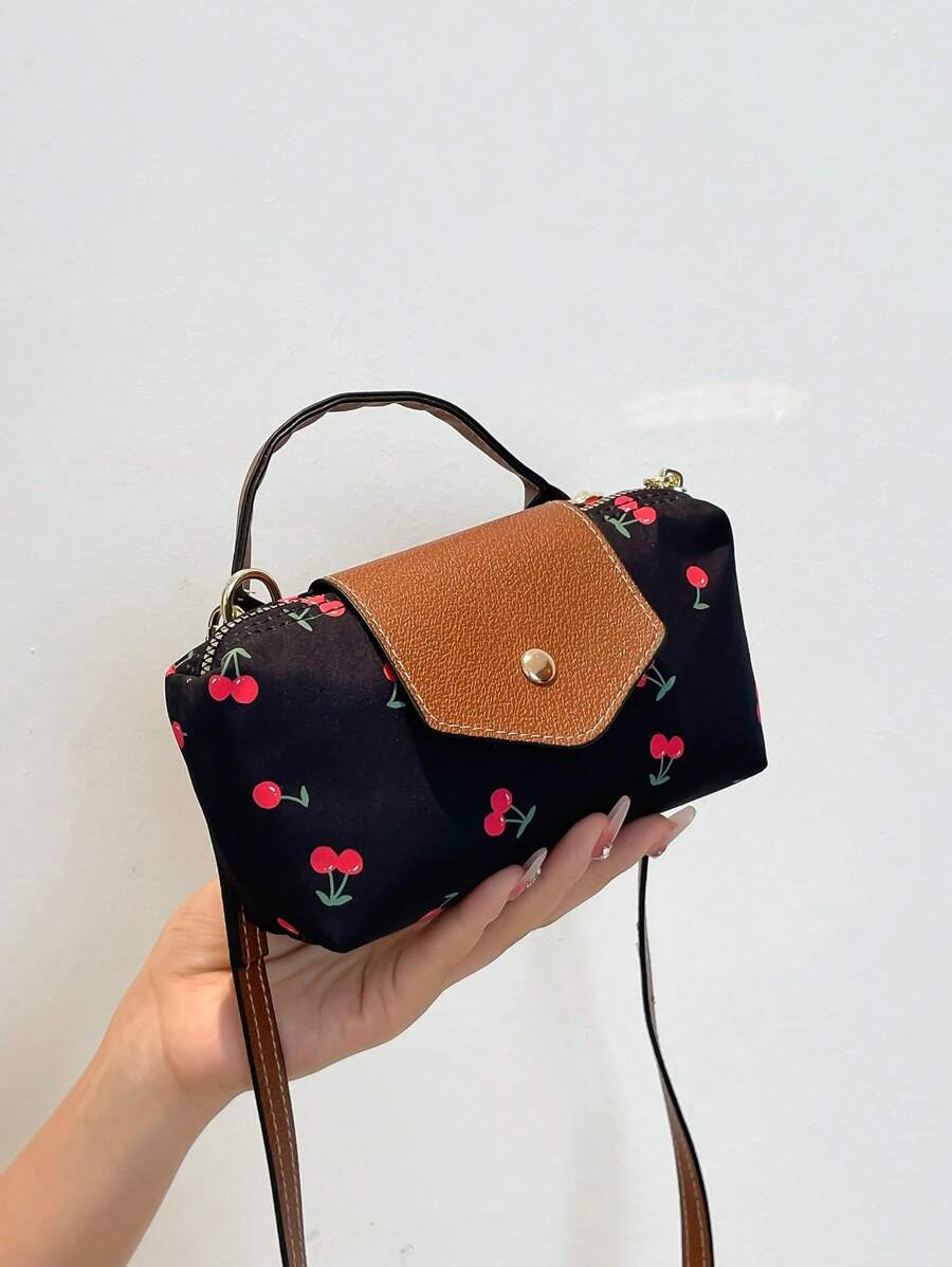 Nuova mini borsa a patta in nylon impermeabile per primavera/estate, borsa a tracolla o a spalla con stampa a ciliegie, adatta per shopping, feste, pendolarismo, rossetto