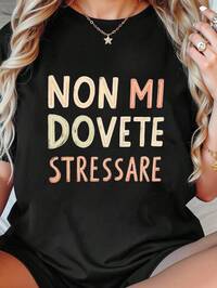 Maglietta elegante da donna a maniche corte e collo tondo - Nera, stampata con il prominente testo italiano "Non Mi Dovete Stressare", adatta per l'abbigliamento casual in primavera ed estate, vestibilità morbida e oversize, taglie forti da donna, abbigliamento autunnale taglie forti, abbigliamento autunnale da donna, outfit autunnali, abbigliamento invernale, abbigliamento invernale da donna, top da esterno #1 Bestseller