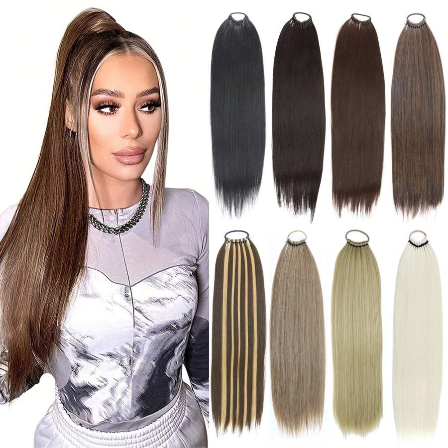 Extensions per coda di cavallo dritta in materiale sintetico da 24 pollici con fascia di gomma elastica, colori biondo, marrone e nero, per le donne per uso quotidiano e feste