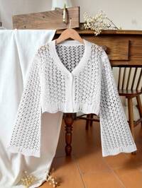 GlowziSHEIN 1 pezzo Cardigan corto a maniche lunghe con scollo a V, tinta unita, design traforato, orlo ondulato, con un solo bottone, adatto per uso quotidiano, casual, all'aperto, shopping e altre occasioni, per primavera/estate/autunno, cardigan corto bianco per ragazze adolescenti