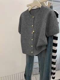 Cardigan da donna, giacca da donna per esterni, maglione da donna, abbigliamento casual urbano da donna, serie di maglieria elegante, stili primaverili/estivi da donna, cardigan aderente in maglia grigio, abbigliamento casual alla moda e confortevole per l'autunno, design semplice per pendolarismo e uso domestico, cardigan da donna con collo rotondo e maniche corte con bottoni in metallo, nuovo arrivo 2026
