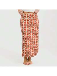 Tramas+ Gonna midi morbida Catania in terracotta con stampa geometrica bianca su sfondo rosso - Versatile design dal taglio midi con spacco laterale ed elastico in vita per un comfort totale - Disponibile nelle taglie S/M e L/XL - Morbida al tatto, ideale per ogni occasione - Accentua il tuo stile con un tocco elegante e moderno