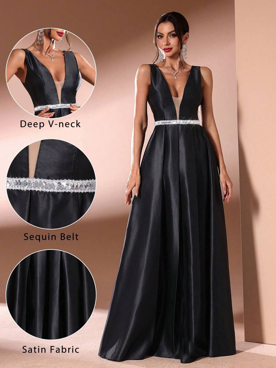 Abiti da sera lunghi da donna con scollo a V senza maniche in raso, con paillettes e cintura, per cerimonie