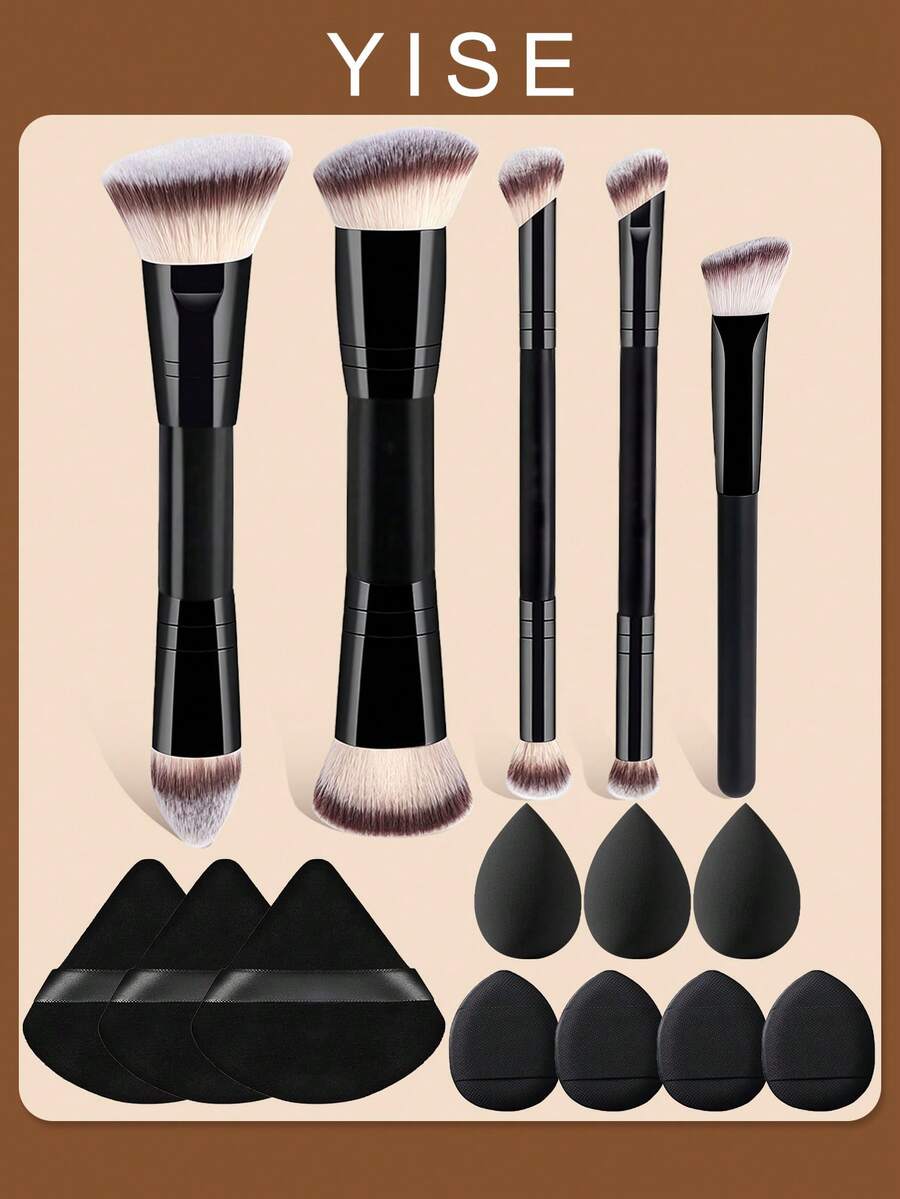 YZIMENG Set di 15/12/7/5 pennelli trucco YISE, set di 5 pennelli trucco a doppia estremità, pennelli trucco piatti e tondi di base per fondotinta liquido, cipria, blush, ombretto, correttore, set di 7 spugnette trucco inclusi 2 mini, 3 cuscinetti vellutati a triangolo, 3 mini cuscinetti ad aria per ritocchi perfetti di trucco, viaggio e feste