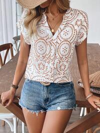 MaijaMaija Camicia casual da spiaggia con scollo a V e bottoni davanti, in tessuto ricamato e traforato, maniche a lanterna, vestibilità slim, adatta per l'estate, San Patrizio, Pasqua, feste estive, vacanze, uscite, laurea, casual, in colore blu chiaro, per donne