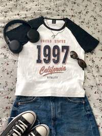 Attitoon Top estivo semplice e casual a collo rotondo stampato con scritta "American 1997", aderente al corpo, adatto per la stagione sportiva delle donne