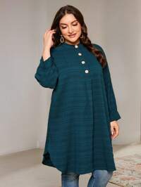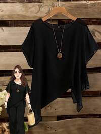 SHEIN CURVE+ Blusa elegante oversize da donna con collo rotondo, manica 3/4, orlo asimmetrico e tinta unita metallica, abbigliamento termico invernale, abiti da donna natalizi, abito maniche lunghe, abito da donna natalizio, minigonna dorata, gonna dorata, abito per il Ringraziamento, abito di Capodanno, abiti da festa