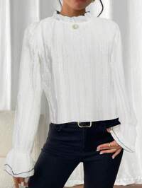 PoésellePoéselle Camicia elegante in cotone bianco con dettagli in pizzo sulla vita e bottoni, camicia a maniche lunghe, camicia in vita, top in pizzo, camicia in pizzo, camicia in cotone, dettaglio elegante in vita, per occasioni di tutti i giorni, essenziale per uno stile sofisticato, autunno/inverno 2024, abbigliamento autunnale