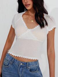 Roylia Maglia a maglia elasticizzata e soffice, tessuto jacquard maglia elasticizzato, tessuto traforato strutturato, tessuto a rete, aderente, snellente, scollo a V profondo, manica corta, orlo con spacco, vita segnata, colletto in pizzo, patchwork in pizzo, semi-trasparente, motivo a fiore marino, bordo con volant, vacanza, festival, elegante, sexy, lussuoso, romantico, per ufficio, minimalista, retrò, da urlo, maglia donna lunghezza regolare primavera/estate