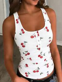 Slaydiva 2026 Primavera/Estate Nuovo Stile Casual da Strada Canotta Bianca Slim Fit con Stampa Ciliegie, Scollo a U Ampio, Maniche Corte Risvoltate. Adatta per Appuntamenti, San Valentino, Stagione di Matrimoni, Vacanze, Spiaggia, Stile Boho, Spiagge Sabbiose, Ritorno a Scuola, Uso Quotidiano, Feste, Tè Pomeridiano, Brunch, Outfit da Aeroporto, Stile Casual da Strada.