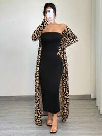 SHEIN SXY CURVESHEIN SXY Set da donna taglie forti in 2 pezzi, giacca lunga e abito aderente, stampa leopardata, adatto per primavera-estate, autunno-inverno, appuntamenti, compleanni, addio al nubilato, casual, shopping, uscite, look semplice da abbinare, valorizza la figura.