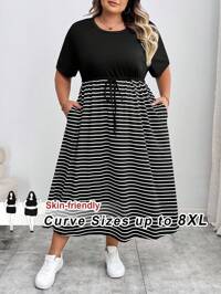 SHEIN CURVE+SHEIN CURVE+ Abito lungo nero con scollo a V, tasche e maniche corte, casual e comodo, adatto per la primavera e l'estate, per donne di taglia curvy. Adatto per outfit casual, da chiesa, stile old money, per insegnanti, per l'aeroporto, stile boho per vacanze al mare, abiti da spiaggia, abiti da laurea, da tea festa.